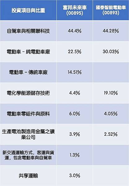 富邦未來車則是以「主題」為出發點,例如挑選的股票除了電動車相關業務以外,也包含了新能源、共享交通等概念,所以也納入不少正在轉型的傳統車廠,如日本的豐田(Toyota)、本田(Honda)及美國的通用汽車(GM)等;目前五大成分股為特斯拉、台積電、輝達、豐田汽車、超微(AMD),合計佔比逾65%。