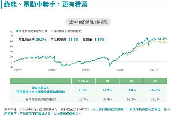 中信綠能及電動車 ETF 為季配息,追蹤指數為臺灣指數公司特選臺灣上市上櫃綠能及電動車指數,布局著重三大產業:綠能、電動車、半導體,並以流動性、財務品質(近 12 季 ROE 總和大於零)、公司治理評鑑篩選高綠金含量企業,採半年調整。根據台灣指數公司資料,統計 2017 年 5 月至 2021 年 7 月底,指數年化報酬率高達 20.3%。