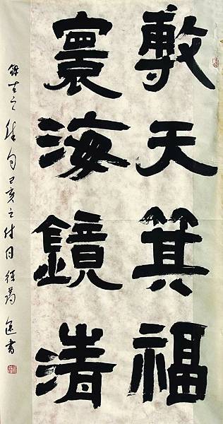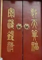 在朝門上寫哪幾個字好呢?這的確是一個難題。既不能太古奧,又不能太隨意。為此我苦思冥想了好幾天,突然想起有一年到北京胡同旅遊時,曾在一民居大門上看見刻“ 敷天福 ,寰海鏡清”對聯。從這副對聯中可以參悟到人們希望天下太平的美好祈願。