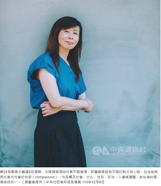 (中央社記者邱祖胤台北8日電)第22屆國家文藝獎今天揭曉,文學類獎項由作家平路獲得,評審認為平路敢於介入現實,作品觸及社會、文化、性別、政治、人權等議題,對台灣的關懷始終如一。