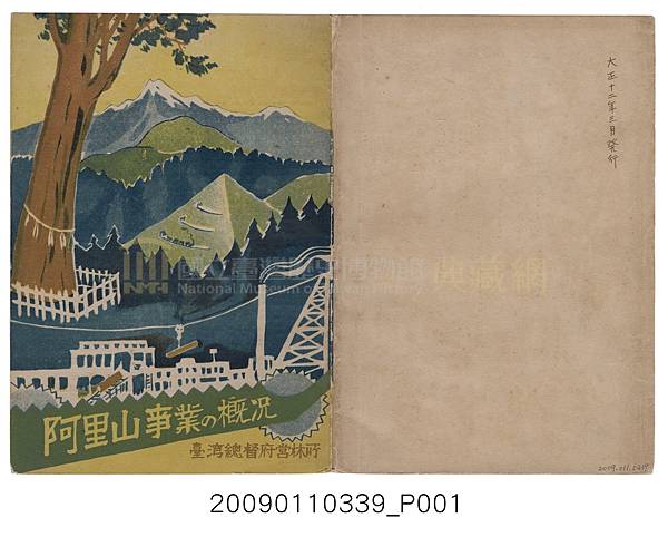 臺灣總督府營林所於1923(大正12)年3月發行之《阿里山事業概況》,性質屬摺頁型小冊子,封面印有阿里山、神木、森林、發電廠等著名地標之手繪彩圖,封底純白,右上角手寫字跡「大正十二年三月發行」,內容包括1張表格、1篇主文、3張地圖等5部分: