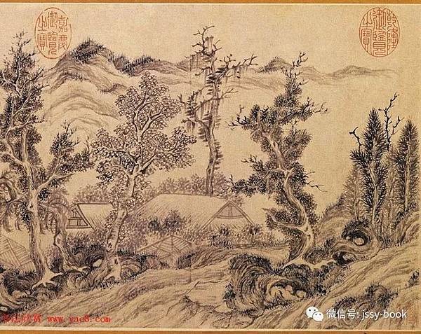 山間梵宇茅舍落錯,屋堂內有高士侍童。筆墨濕潤山巒披麻皴、解索皴並用,濃墨點苔,繁複厚重。