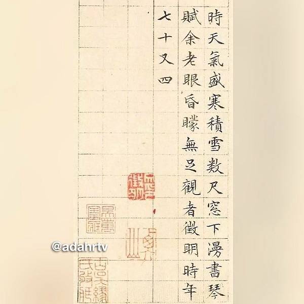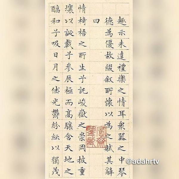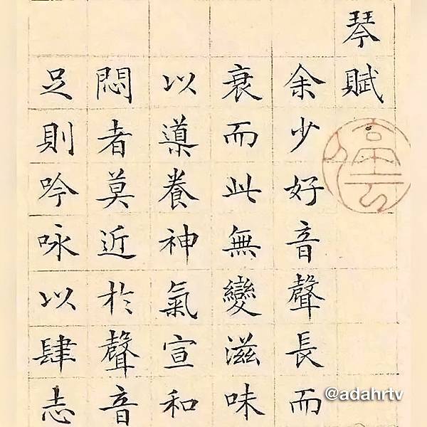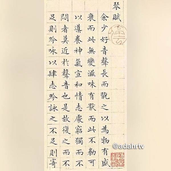 此為文徵明七十四歲時作小楷《琴賦》,字大1.5釐米左右,結構精准,筆力不衰。雖然他在題款中道到:「余老眼昏蒙,無足觀者」。但此帖仍不失為文徵明成熟時期小楷精品,法度嚴謹純熟,結體穩健,善於留白。