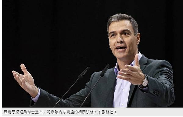 〔即時新聞/綜合報導〕脅迫婦女賣淫問題再西班牙相當嚴重,西國總理桑傑士(Pedro Sánchez)17日公開宣示,承諾政府將會推動廢除「奴役」女性合法賣淫的相關法條。