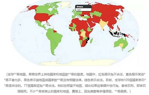 (全球**易地圖,看看世界上其他國家和地區對**易的態度。地圖中,紅色顯示為不合法,黃色顯示某些**易不會允許,黑色表示該地區或國家對**易沒有相關法律。綠色表示合法。目前,全球有109個國家表示**易是非法的。77個國家認為**易合法。例如在阿富汗地區,婦女如果從事婚外性行為,會被石刑,即被石頭砸死。不少**易被禁止的國家和地區,實際上,因為貧窮等多種原因,**易猖獗。)