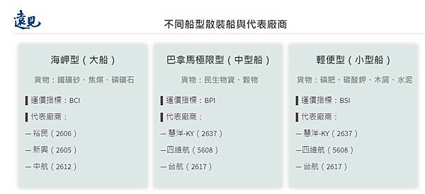 散裝船則可分大、中、小三種船型,專載大宗原物料,如鐵礦砂、煤炭、穀物等;船上無貨櫃,且貨物通常到岸即進工廠,後續物流鏈也較單純。代表廠商如裕民、慧洋、新興、中航、台航等。