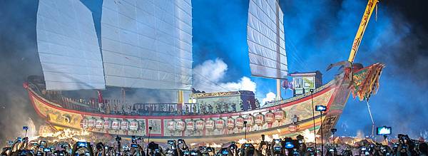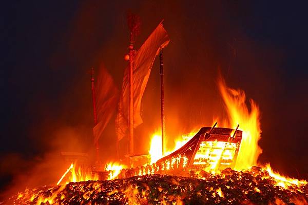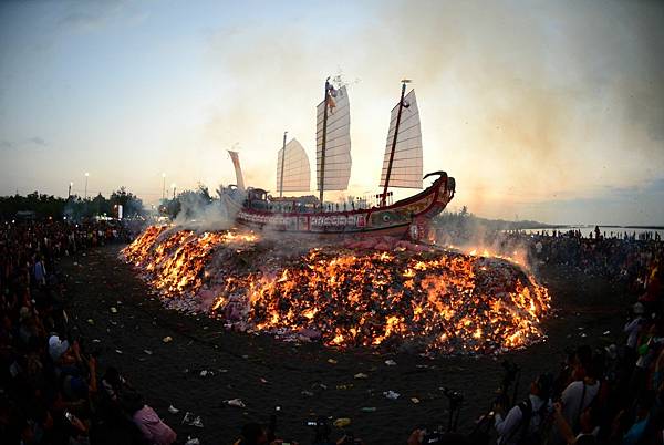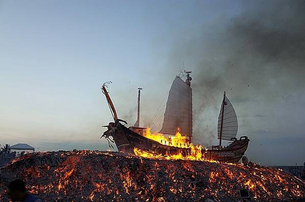 王船是整個迎王祭典中最重要的法器,為期8天7夜的整個迎王活動,7個夜間都讓東港熱如不夜城,但最後一個凌晨卻是一反常態,由火舌默默的席捲王船,而在地東港人早已離去。