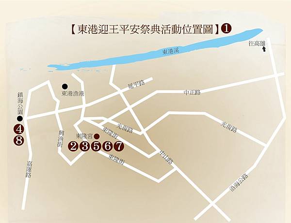 「東港迎王平安祭典」 由東港東隆宮所主辦,此俗推估約形成於清領初期,惟其後演變情況不明;日治時期,根據《臺灣日日新報》之報導,舉辦王醮時間有時在秋天,有時在春天。日昭和 12年( 1937)丁丑科後中斷 14年未辦,直至 1952年春天始恢復舉行,至翌科( 1955)因戒嚴時期申請許可問題改以利用雙十節慶典名義舉辦迎王祭典,此後即固定在 10月底前後(農曆 8 9月)舉行, 逢丑、辰、未、戌 3年一科的辦理週期,也就此明顯確立祭典核心時程前後 8天 。其辦理動機,原緣於驅瘟除疫之俗,其後隨著時代演進而加入不同信仰元素,至近代始定稱為「東港迎王平安祭典」,最早「四縣份」的祭祀形態,也由「七角頭」所取代,遶境範圍並擴充至東港周邊農區(市郊農業聚落);而原竹架紙糊的王船,亦在 1973年易為木造大船,祭典主導者的「大總理」,更數度變更制度。