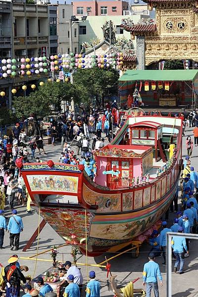 東港迎王8天祭典活動,將進入活動的最後重頭戲,今天中午12時許,進行「遷船」儀式,王船將由「七角頭」轎班推拉進行全鎮的遶境「收煞驅瘟」;上午王船已遷出王船廠,壯觀華麗的王船吸引許多遊客觀賞拍照。