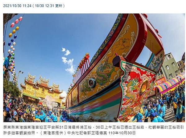 2021/10/30 11:24(10/30 12:31 更新)東港迎王祭王船遶境 壯觀陸上行舟錯過再等3年 | 生活 | 中央社 CNA https://bit.ly/3jTsWtf