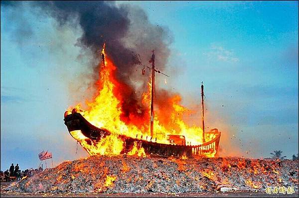 東港迎王平安祭典最經典的燒王船畫面。(資料照,記者陳彥廷攝)