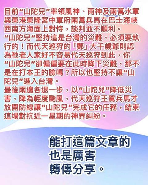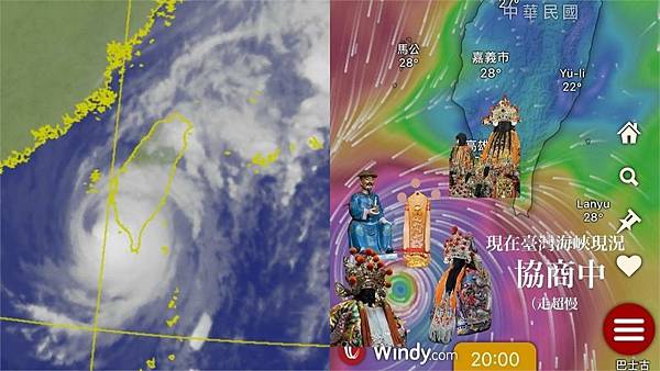 中颱山陀兒來勢洶洶,罕見的以「龜速」前進,加上過去幾天都在高雄外海原地打轉,原因讓人摸不著頭緒;社群平台上瘋狂流傳「神明談判高清照」,有信徒解讀颱風緩速移動是東港溫王爺擋災,強調山陀兒率領風神、雨神及兩萬水軍,與東港東隆宮中軍府兩萬兵馬、在巴士海峽西南方海面上「對峙談判」,讓網友大讚「山陀兒是護國神颱」的言論,甚至有網友表示「颱風在防止糾紛」,擋住中國軍演,相關貼文瘋傳,引發熱烈討論。 高清照曝!網傳東港王爺「駕兵馬」海上談判山陀兒「神界糾紛」一觸即發