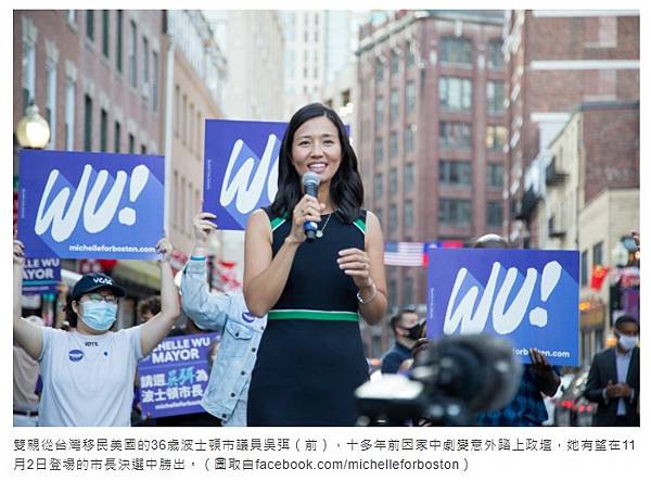 美國波士頓,雙親出身台灣的吳弭 (Michelle Wu) 在波士頓的市長補選中勝出,是波士頓兩百多年以來第一位在選舉中勝出的亞裔女性市長。