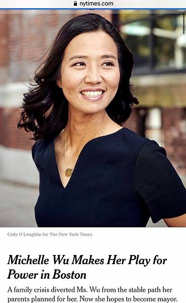 紐約時報今天報導,波士頓選民愈來愈年輕化、受過良好教育且左傾,吳弭(Michelle Wu)在參議員華倫(Elizabeth Warren)提攜下,在這座處於轉折的城市開展她的政治生涯。