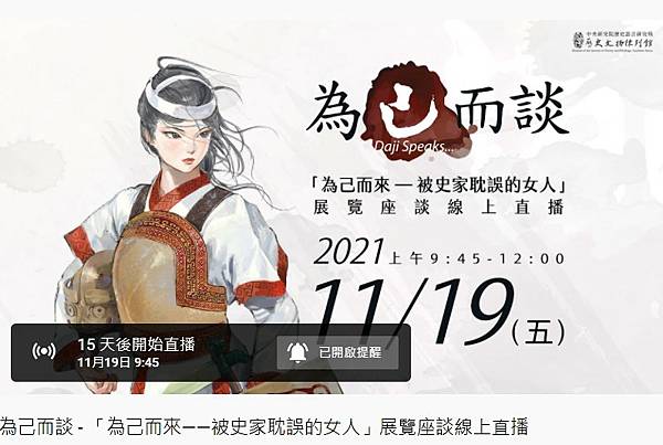 歷史文物陳列館舉辦「為己而來——被史家耽誤的女人」特展,邀請最強、最美、最被誤解的女人——妲己,穿越時空、現身本館,告訴大家史書沒說的真相。為己而談 - 「為己而來——被史家耽誤的女人」展覽座談線上直播 - YouTube https://bit.ly/3wcYdMD
