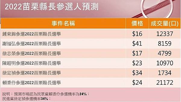 未來事件交易所「第十屆立法委員(台中市第二選區)缺額補選 當選人預測」,設有顏寬恆、林靜儀、林金連等預測市場期貨。若事件價格越接近$100,表示市場預期該預測對象越可能成真;若事件價格越接近$0則相反。預測進行時間至2021年12月30日。