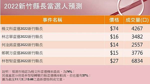 2014年縣市長選舉,未來事件交易所在22縣市中,預測18縣市準確,僅4縣市失準,準確率82%,較同一時期的民意調查,準確率較高。
