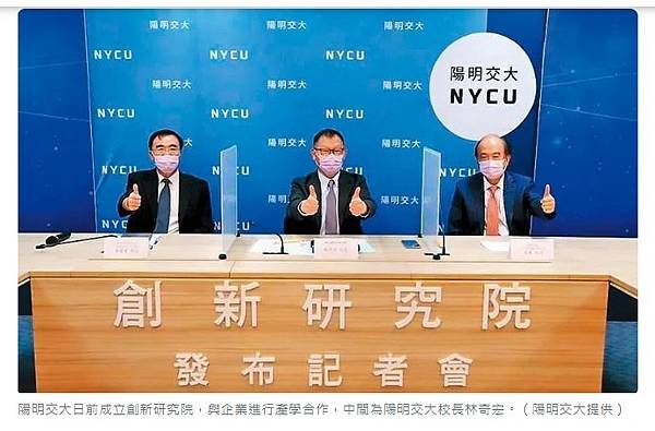 陽明交大日前成立創新研究院,與企業進行產學合作,中間為陽明交大校長林奇宏。(陽明交大提供)