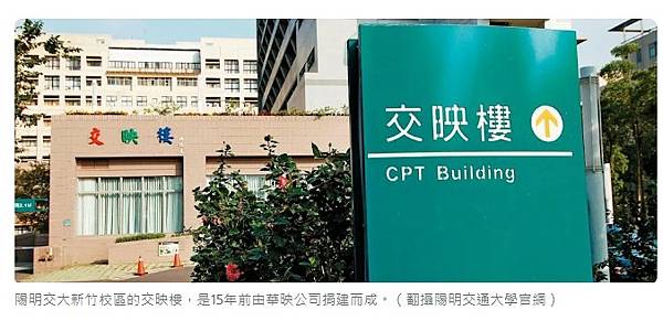 陽明交大新竹校區的交映樓,是15年前由華映公司捐建而成。(翻攝陽明交通大學官網)© 由 鏡週刊 提供 陽明交大新竹校區的交映樓,是15年前由華映公司捐建而成。(翻攝陽明交通大學官網)