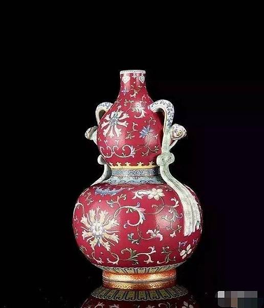 清乾隆 胭脂紅地粉彩纏枝蓮紋綬帶如意耳葫蘆瓶