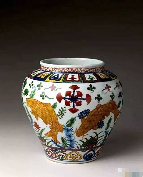 明嘉靖 五彩魚藻紋罐