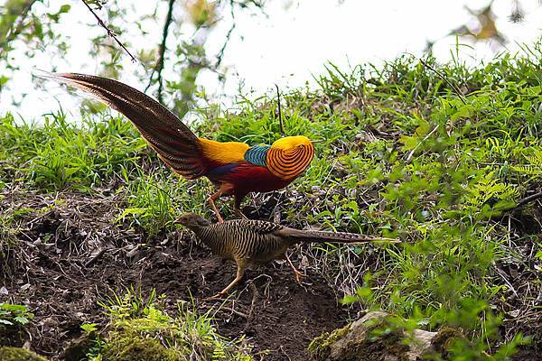 四川唐家河的野生紅腹錦雞,雄鳥正為雌鳥跳求偶舞。紅腹錦雞在此地是優勢本土鳥種