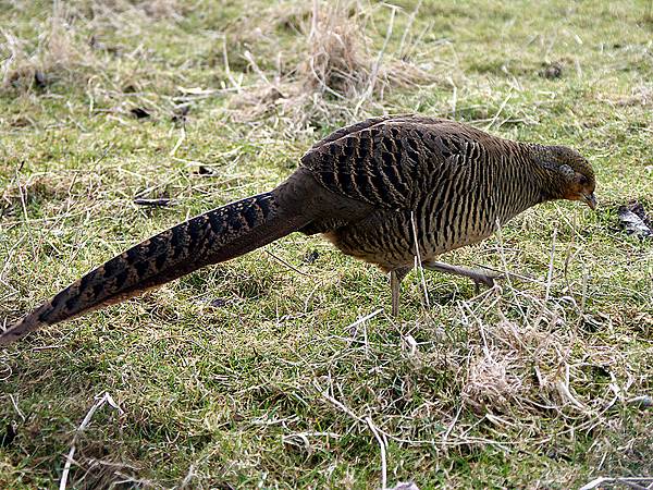 紅腹錦雞尾羽較長,中央尾羽兩枚以黑色為基色具淡黃色色斑。(公有領域)