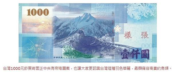 台灣1000元鈔票背面正中央有帝雉圖案,也讓大家更認識台灣這種羽色華麗,最顯雍容高貴的鳥類。(中央銀行提供)