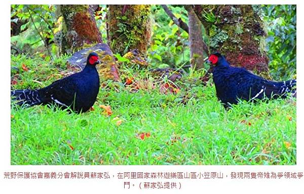 荒野保護協會嘉義分會解說員蘇家弘,在阿里國家森林遊樂區山區小笠原山,發現兩隻帝雉為爭領域爭鬥。(蘇家弘提供)