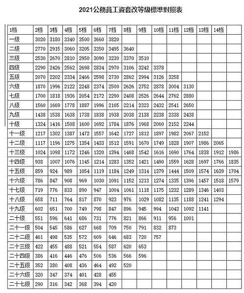 中國現行公務員工資制度是由2006年7月1日開始實施的《公務員工資制度改革方案》確定的。按照該方案,公務員工資包括基本工資、津貼、補貼和獎金。基本工資由職務工資和級別工資兩項構成,標准全國統一。公務員職務高,相應級別就高,基本工資也高。從國務院總理到鄉鎮一級政府的科員、辦事員,共分27個級別。基本工資最高與最低的比例是12:1。統計資料顯示,中國約有公務員700萬人,90%以上職位層次在科級以下。中國人力資源和社會保障年鑒數據顯示,2012年全國公務員的年平均工資是48608元人民幣,全國國有企業人員的年平均工資是51689元。