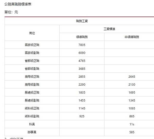 北京市在2003年實施“3581”陽光工資體系,即科、處、局、部級干部月薪分別約為3000元、5000元、8000元以及10000元。有調查稱,一個北京行政機構的普通正科級公務員,工資不到6000元,副處級將近7000元,正處級7700元左右。據報道,在上海,一副科級公務員晒出的收入賬單顯示,他全年總收入不超過8萬元。