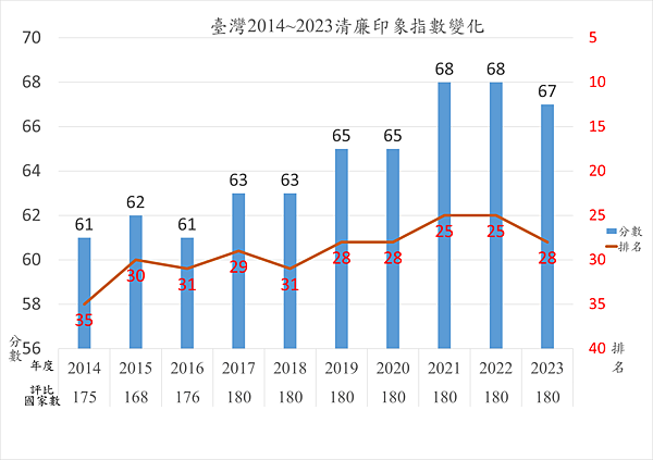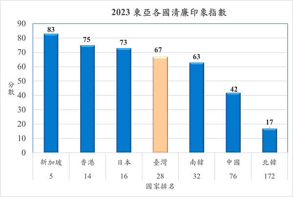 清廉印象指數是由國際透明組織蒐集過去兩年來自12個國際性組織的13個原始調查資料而成。2023年臺灣的分數67分、排名28名,2022年是68分、25名,在東亞仍僅次於新加坡(83分)、香港(75分)和日本(73分)。顯示我國屬於是持續努力,排名雖仍列前15%,但仍和高分組國家有相當距離,需持續改善。