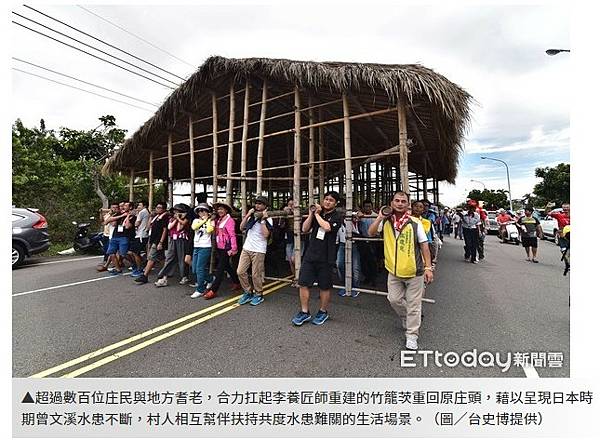國立台灣歷史博物館,與溪南寮、新吉庄、南興國小,24日共同舉辦「重返歷史:百人扛茨 (厝)走溪流」歷史體驗活動,讓民眾重新了解90年前村莊因水患遷村的歷史事件,超過數百位庄民與地方耆老,合力扛起李養匠師重建的竹籠茨重回原庄頭,藉以呈現日本時期曾文溪水患不斷,村人相互幫伴扶持共度水患難關的生活場景,場面盛大。