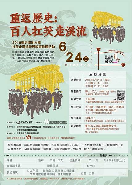 報名費用:100元/人(含保險、茶水、點心),溪南寮&新吉庄庄民報名扛茨亦同等提供