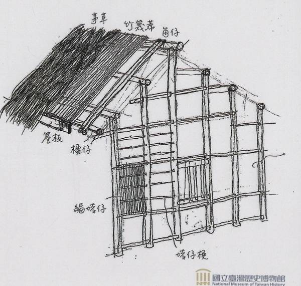 至此,屋子的主結構已經完成,門與窗當然也是計算過尺寸才能安裝。最費工的步驟是牆面,先安裝堵仔梗(牆面橫條),再編入竹篾片,最後塗上防風的濕泥或石灰(古早塗的是牛糞),便大致完工。