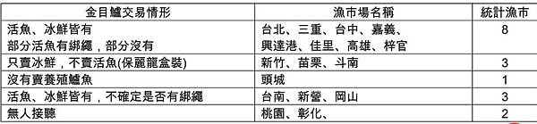 據農委會統計,全台共有24個漁市,其中有金目鱸交易紀錄共17處,台灣動物社會研究會以電話訪查,發現北中南市場均有「活體弓魚」交易。