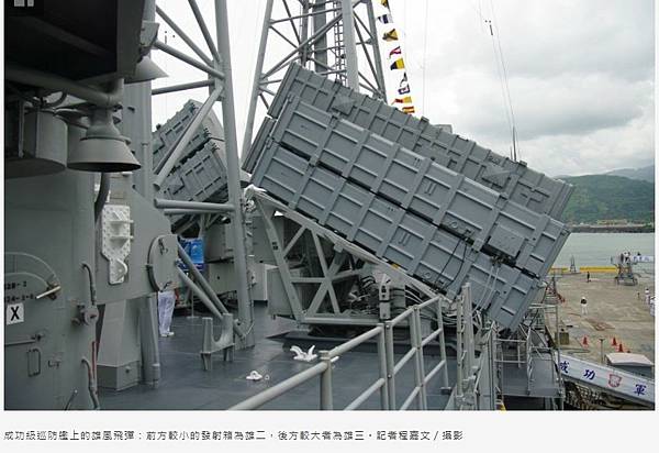 成功級巡防艦上的雄風飛彈:前方較小的發射箱為雄二,後方較大者為雄三。記者程嘉文/...