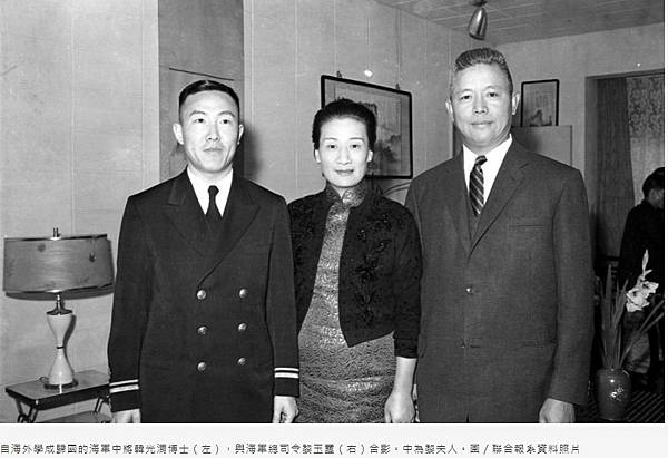 自海外學成歸國的海軍中將韓光渭博士(左),與海軍總司令黎玉璽(右)合影。中為黎夫...