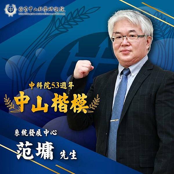 中科院今年為53週年院慶,為鼓勵研發及產製人員士氣,今年選出具傑出表現的「中山楷模」及模範團隊,范墉以雄風飛彈製程技藝專精優異,協助計畫突破瓶頸,獲選為本屆「中山楷模」。