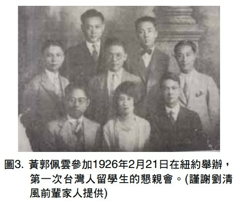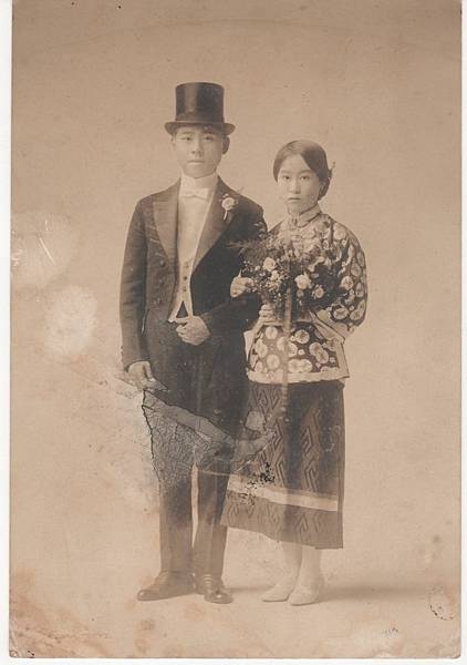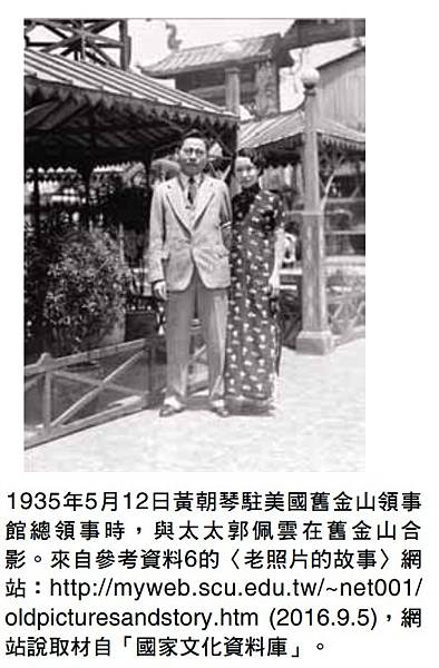 25歲早稻田台灣學生黃朝琴和20歲東京虎門高等女校畢業的郭佩雲在東京中華公使館結婚,晚上假上野公園精養軒開披露宴,這是當天結婚照。郭佩雲是中日混血兒,父親郭左淇是上海實業家也是公使館一等秘書。