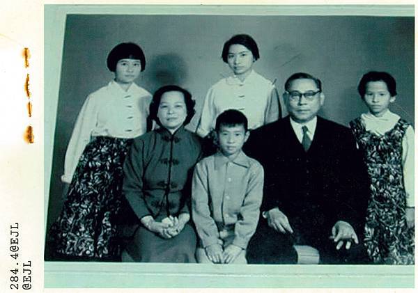 鹽水名仕黃朝琴與陳印蓮伉儷全家福,圖中男孩為黃朝琴獨子黃玉堂、後排左起為次女婷婷、長女蘭君、三女玲玲(前排右二)。黃