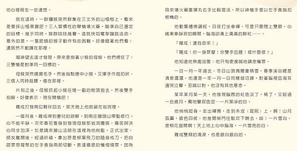 那血海與索命吶喊還是糾纏著。數年之後某天深夜,羅成禱告後,以當年取人性命的飛刀,切下扣扳機的左手食指……