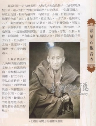 清光緒24年,羅成60歲時才隱居於石洞修行,20年後圓寂,法號普雲,也成了石觀音寺的開山祖師。