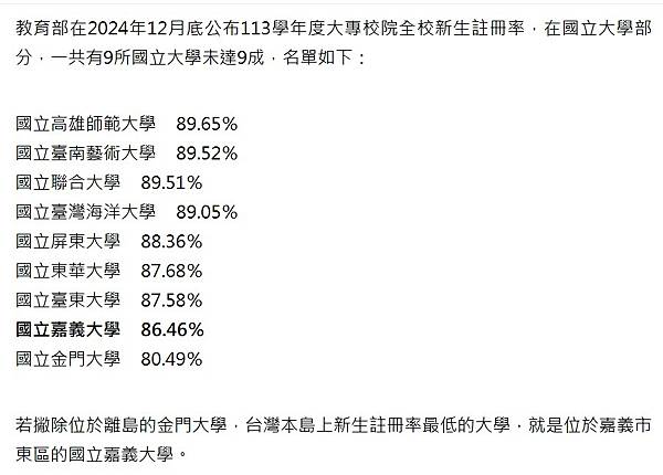 國立大學部分註冊率最低的是位在離島的金門大學,但仍有超過8成的註冊率。