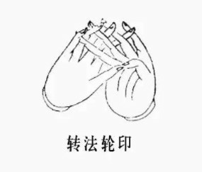另一常見的手印,則是轉法輪印。當佛陀安住在本然法性之後,由於大悲心而轉動法輪,所結說法印,全部的手指曲線是圓的,表示以最柔軟的心來轉動法輪,所以很自然地,佛陀是把法界中圓滿的境界轉動起來,而降魔印是把體性和外界降伏到不動狀況。