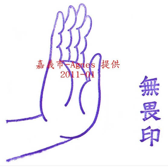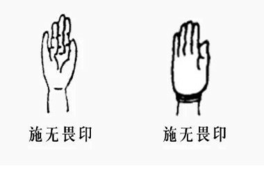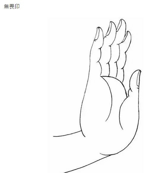 屈臂上舉於胸前,手指自然舒展,手掌向外。此手印表示了佛為救濟眾生的大慈心願。