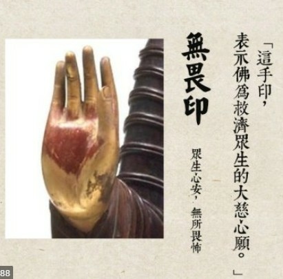 即右手曲肘朝前,舒五指,手掌向前,即布施無怖畏給與眾生的意思,這是佛陀為了救濟眾生,使他們能夠安心,所施予的印相。這種印相與說法時的印相相通用,如在經論中所說的舉手說法,即是此印相。