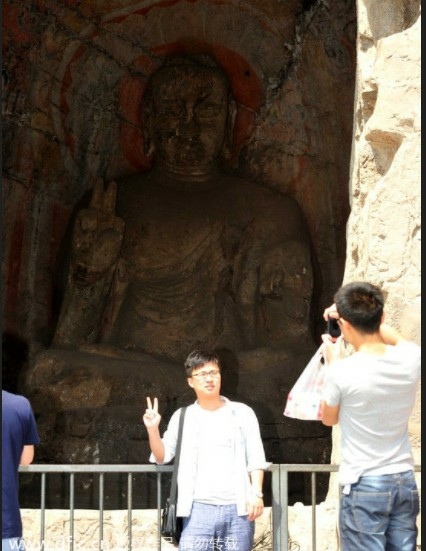 龍門石窟“不正經”佛像,手比剪刀手,遊客爭相與其合照