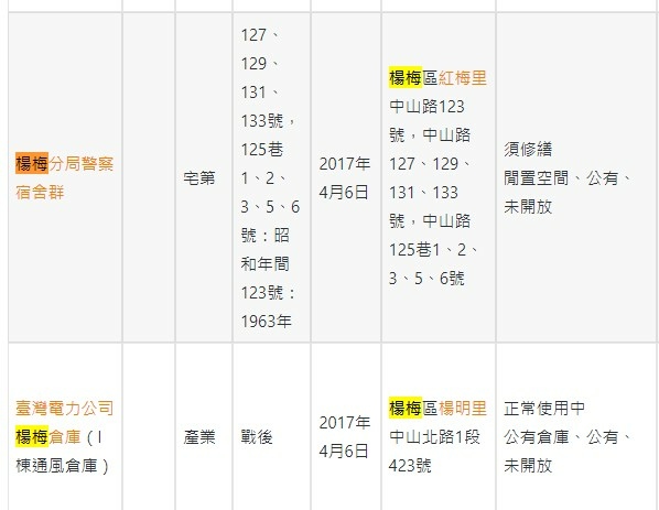 123號:1963年 2017年4月6日 楊梅區紅梅里中山路123號,中山路127、129、131、133號,中山路125巷1、2、3、5、6號 須修繕