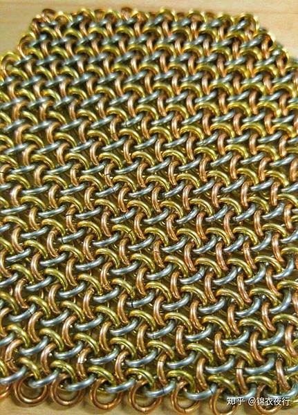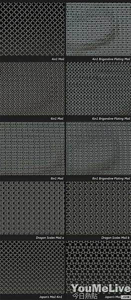 實際上山文甲就是環鎖鎧,為什麼這樣說?因為鎖子甲的環可以有不同的編綴形式,其在視覺上就有不同的表現,圖24就是環鎖甲的不同編綴方式,這樣的編綴呈現的三角形式就是山文甲外形的表現形態。